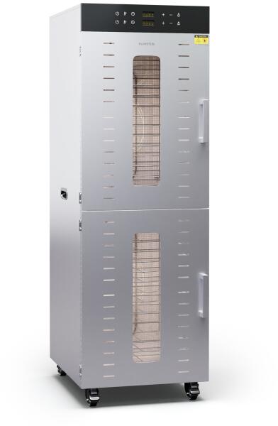 Nagy teljesítményű szárító Klarstein MasterJerky 500 Vertical rekordgyorsasággal szárítja a gyümölcsöket, zöldségeket, húsokat és egyéb élelmiszereket. Ez azt jelenti, hogy rövid idő alatt maga is elkészítheti az ízletes rágcsálnivalókat és a tartós alapanyagokat. Legyen szó vitaminokban gazdag szárított gyümölcsökről, például alma- és banánchipsről, vagy egészséges zöldségekről, például szárított paradicsomról. A Master Jerky 500 minden élelmiszerhez a megfelelő szárítási hőmérsékletet biztosítja. A Klarstein Master Jerky 500 Vertical aszaló hatalmas, 3000 W-os hőteljesítményével és 4 ventilátorának (kamránként kettő) egyenletes hőeloszlásával gondoskodik az optimális élelmiszer szárításról és a rövid szárítási időről. A 32 kivehető rozsdamentes acél polc mindegyike 40 x 38 cm-es helyet kínál, így a teljes terület akár 4,86 m2 is lehet. Különösen praktikus a két különálló szárítókamra, amelyek egymástól függetlenül működtethetők. Ideális feltételek a professzionális szárításhoz, pl. szárított marhahús, teák vagy szárított gyümölcsök szaküzleteiben. A különböző ételek rugalmas elkészítéséhez a hőmérséklet 30 és 90 °C között állítható az érintőképernyős kezelőpanelen. Az akár 24 órás időzítő is biztosítja a szárítandó élelmiszer tulajdonságainak optimális összehangolását. A teljesen automatikus szárítási folyamatnak és a pontos hőmérséklet-szabályozásnak köszönhetően minden tökéletesen történik. A fontos tápanyagok és vitaminok megmaradnak, az íz pedig javul. A MasterJerky 500 Vertical természetesen szárított virágok készítésére is alkalmas kompozíciókhoz vagy szárított gyógynövények és teák kíméletes extrahálására. A Klarstein MasterJerky 500 Vertical szárítógép tisztítása a szárítási folyamat után teljesen egyszerű: a csepptálcák és a rozsdamentes acél betétek egyszerűen öblíthetők vagy tisztíthatók a mosogatógépben. A rozsdamentes acél borítás könnyen letörölhető, a padlógörgőkkel pedig könnyen mozgatható.